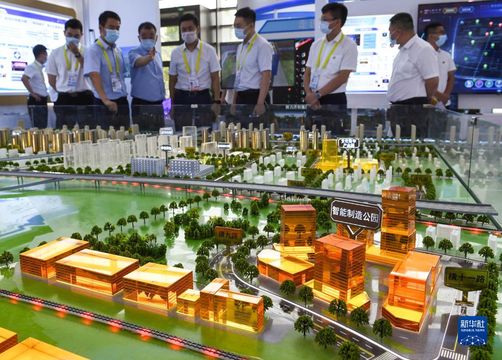 8月16日,在第六屆絲綢之路國際博覽會陜建展區,工作人員在智能制造項目模型前進行講解。