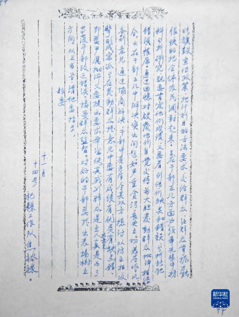 這是《杞縣一區(qū)謝砦鄉(xiāng)第一步工作報(bào)告》手稿尾頁(yè),落款為杞縣工作隊(duì)焦裕祿(2022年8月5日攝)。新華社記者 韓朝陽(yáng) 攝