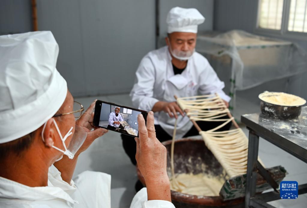 8月16日,李念平在進行“纏筷子”工序,父親李長滿(左)為他錄制視頻。