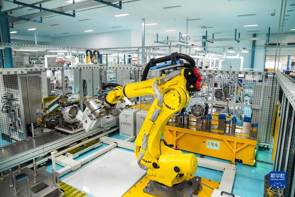 在哈爾濱東安汽車(chē)動(dòng)力股份有限公司生產(chǎn)車(chē)間,一臺(tái)機(jī)械臂在生產(chǎn)作業(yè)(8月16日攝)。