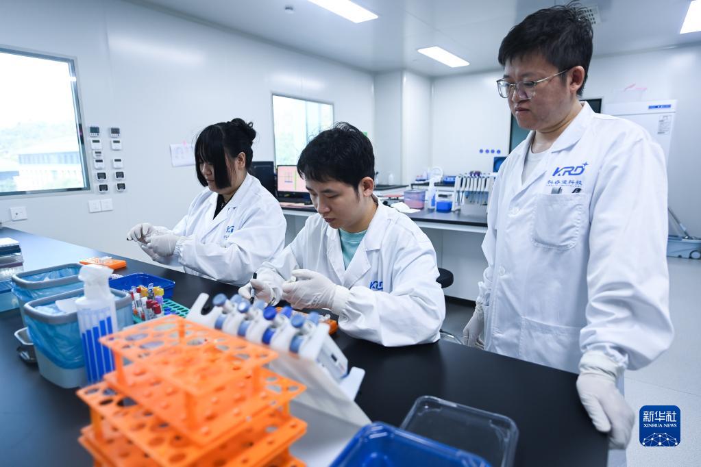 8月17日,在杭州科睿迪智檢醫(yī)學(xué)檢驗(yàn)實(shí)驗(yàn)室有限公司的實(shí)驗(yàn)室里,檢驗(yàn)師郭成忠(右一)帶著年輕員工做實(shí)驗(yàn)。這是一家專(zhuān)業(yè)從事醫(yī)學(xué)檢測(cè)與科研轉(zhuǎn)化的高科技企業(yè),通過(guò)政府部門(mén)的牽線搭橋,成為當(dāng)?shù)蒯t(yī)學(xué)院科研實(shí)習(xí)基地。