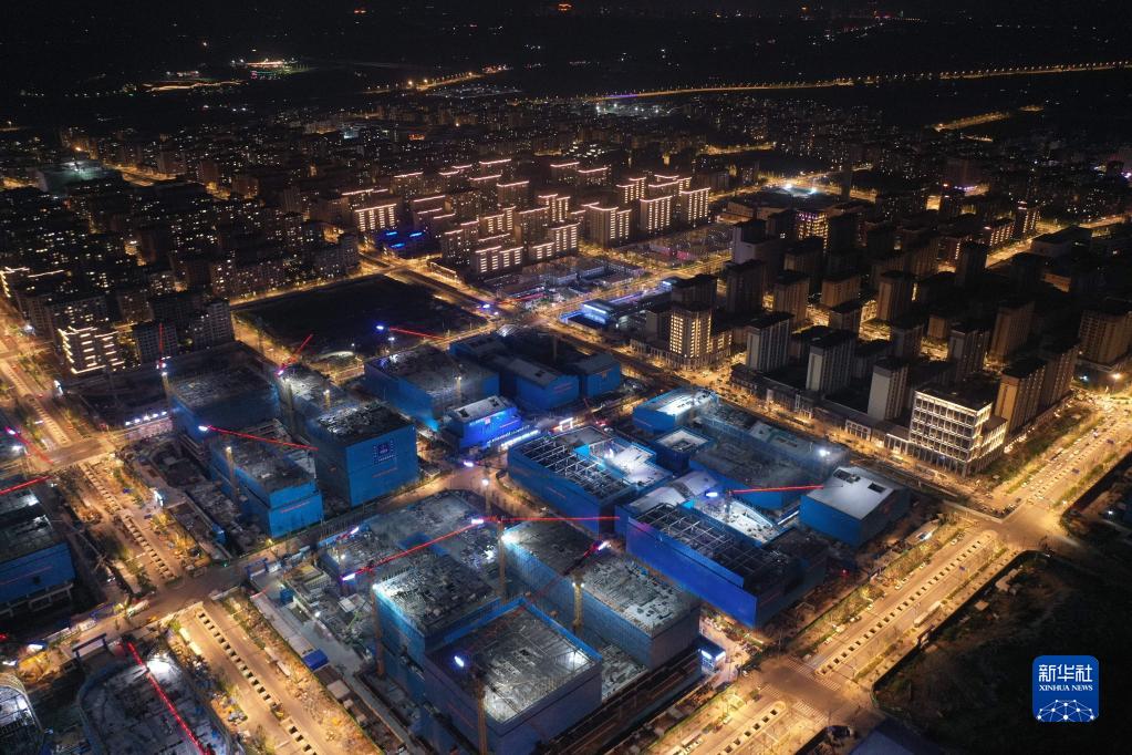 河北雄安新區容東片區雄安·電建智匯城建設項目夜景(8月17日攝,無人機照片)。