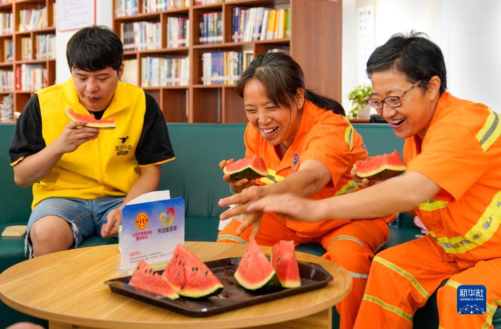 8月17日,重慶市九龍坡區謝家灣街道萬象城的工會戶外勞動者服務站內,環衛工人品嘗工會送到服務站的西瓜。
