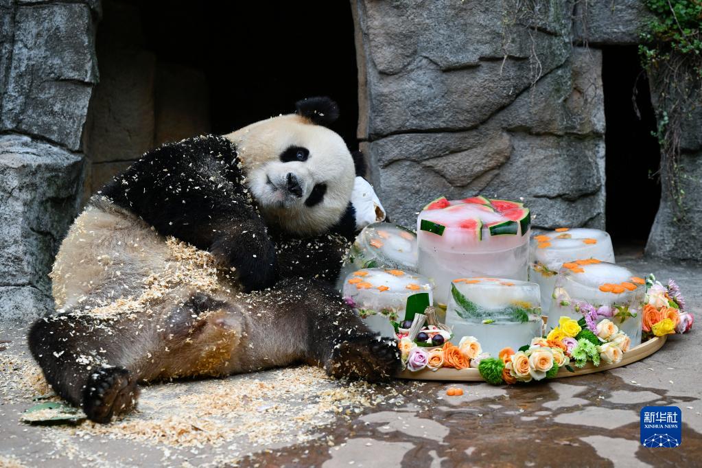 8月18日,中國大熊貓保護(hù)研究中心都江堰基地7歲的雄性大熊貓“青青”在享受清涼生日美食。