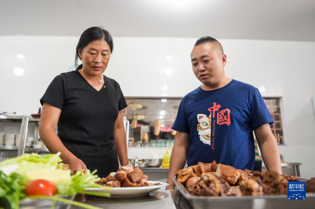 8月17日,在扎賚特旗好力保農業專業合作社內的農家樂,宋春平(左)查看菜品。