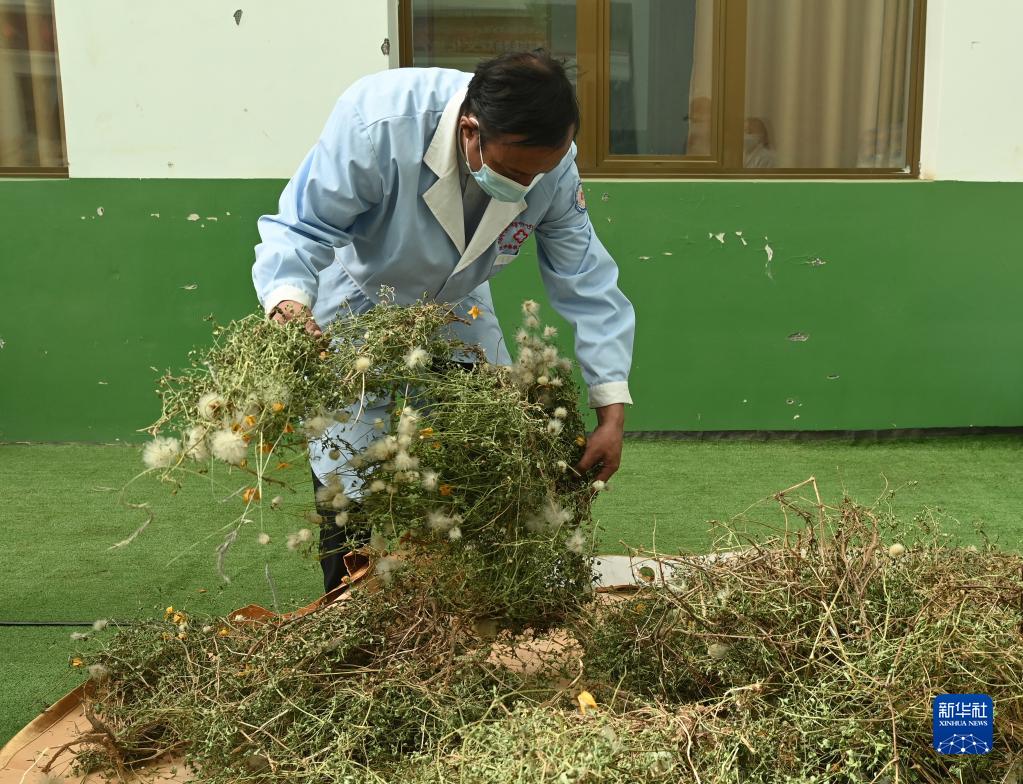 在治多縣索加鄉衛生院,布久索南更青整理采集晾曬的藥材(8月11日攝)。