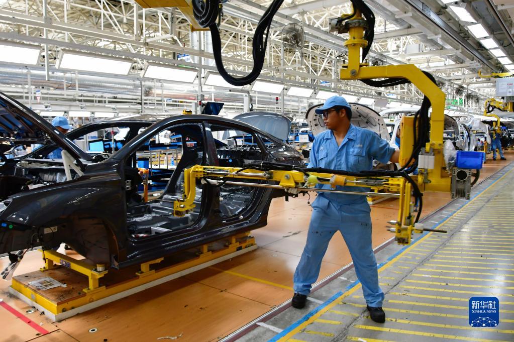 8月18日,在上汽集團乘用車寧德基地總裝車間,工人在新能源汽車生產線上作業。