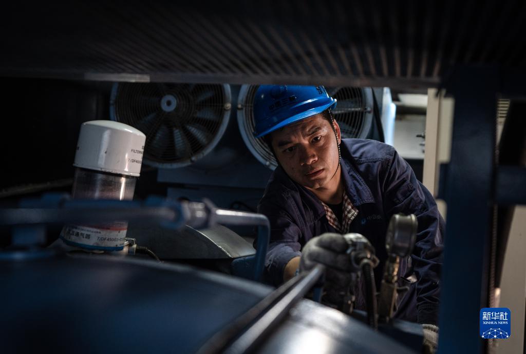 8月18日,三峽姚安發電場工程人員在風力發電機內進行檢修。