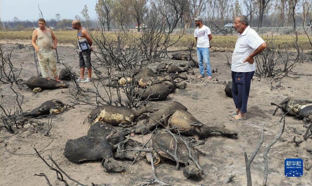 8月18日,在阿爾及利亞泰賴夫省,人們查看被森林火災燒死的牲畜。