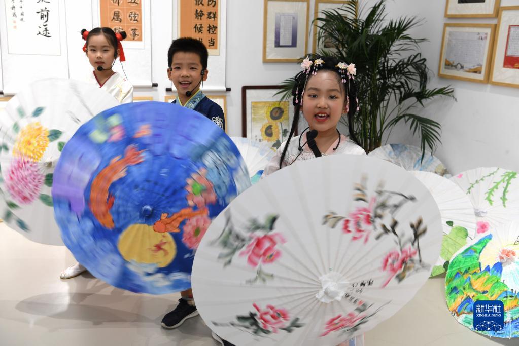 8月19日,合肥市六安路小學翠微分校的學生在展示手工繪制的傘面。