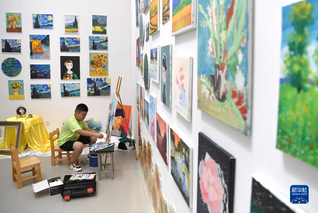 8月19日,合肥市六安路小學(xué)翠微分校的學(xué)生在繪畫作品展示區(qū)創(chuàng)作。