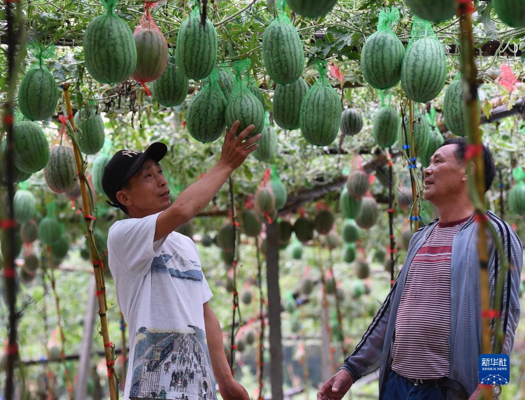 在福建省福州市閩侯縣大湖鄉(xiāng)東姚村的“湖東果蔬農(nóng)民專業(yè)合作社”種植基地,村民在查看西瓜長勢(8月17日攝)。