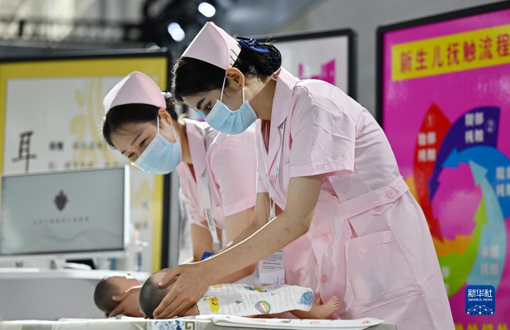 8月19日,在國家會展中心(天津),首屆世界職業院校技能大賽的參賽選手在演示新生兒撫觸。