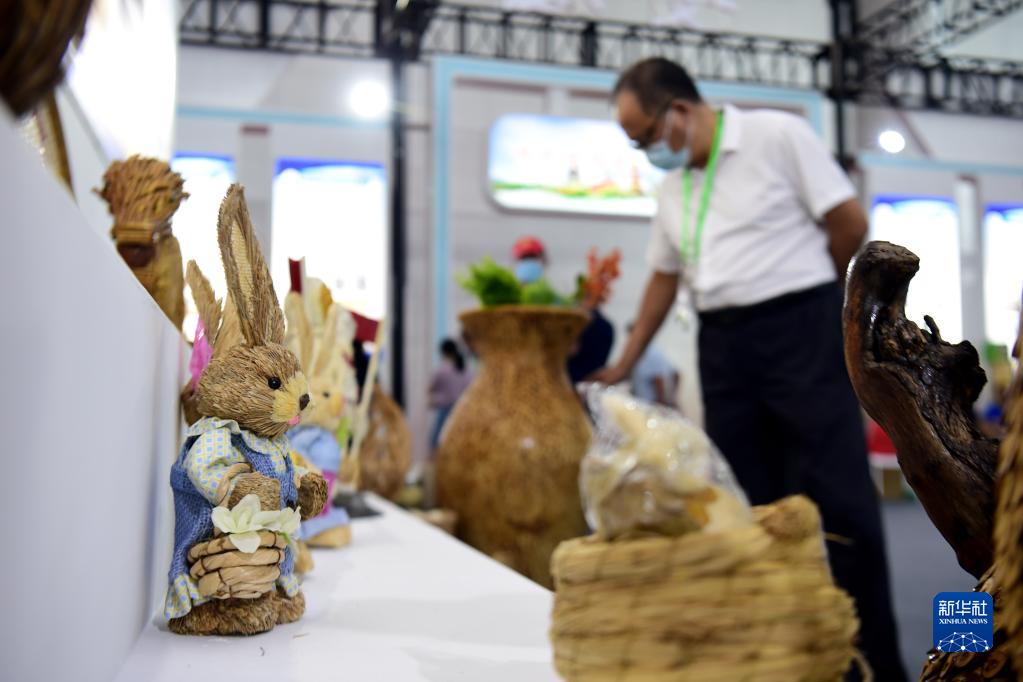 8月19日,與會者在2022安徽秸稈暨畜禽養殖廢棄物綜合利用產業博覽會上觀看用秸稈制作的工藝品。
