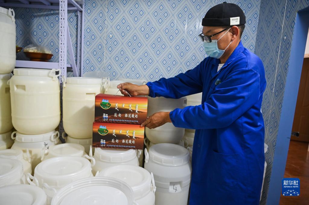 8月18日,蘇尼特右旗雙峰駝繁育養(yǎng)殖基地職工馬拉慶夫在冷庫(kù)里查看駝奶制品。