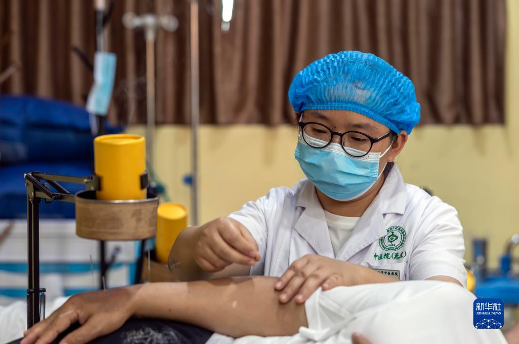 8月19日,醫生在貴州省黔西市中醫醫院國醫館為患者進行針灸治療。