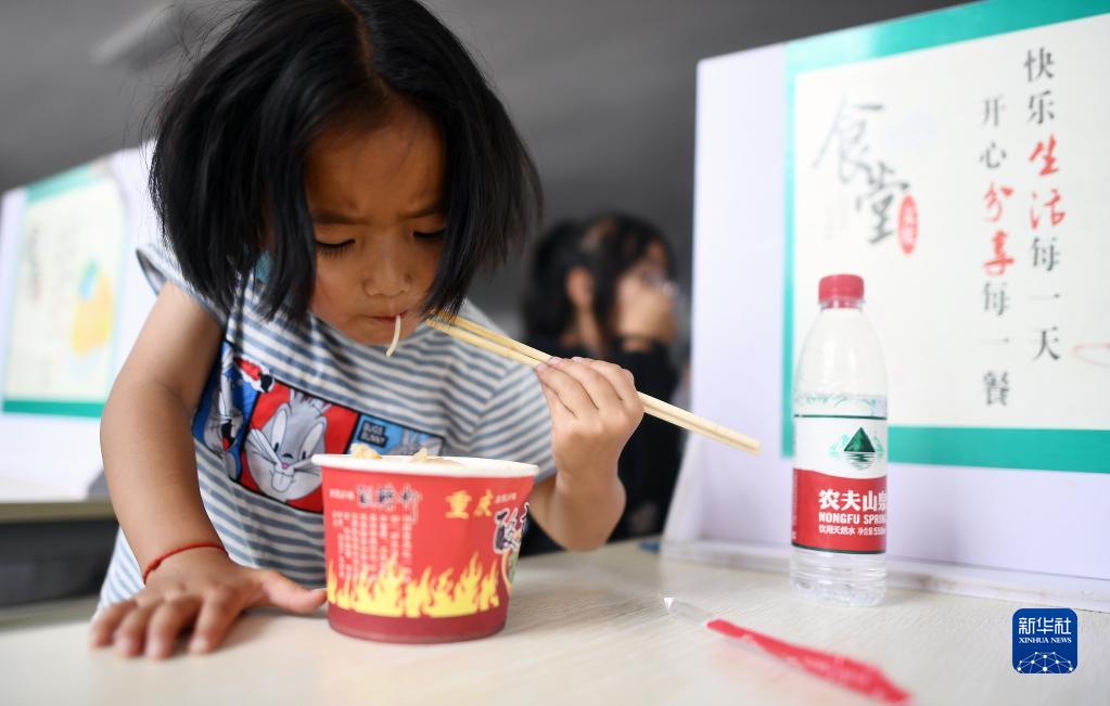 8月19日,小朋友在大通一中臨時安置點餐廳內吃午餐。