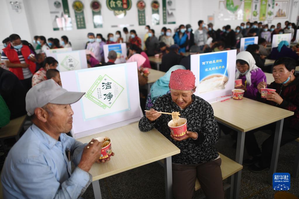 8月19日,受災群眾在臨時安置點餐廳內吃午餐。