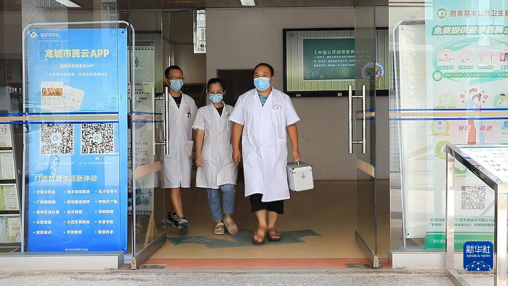 李秋菊(中)和同事下村巡診(8月17日攝)。