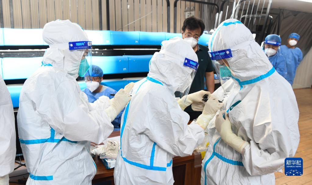 8月16日,在海南陵水黎族自治縣體育館氣膜實驗室,山東省醫(yī)療隊醫(yī)務人員在防護服上寫下名字。