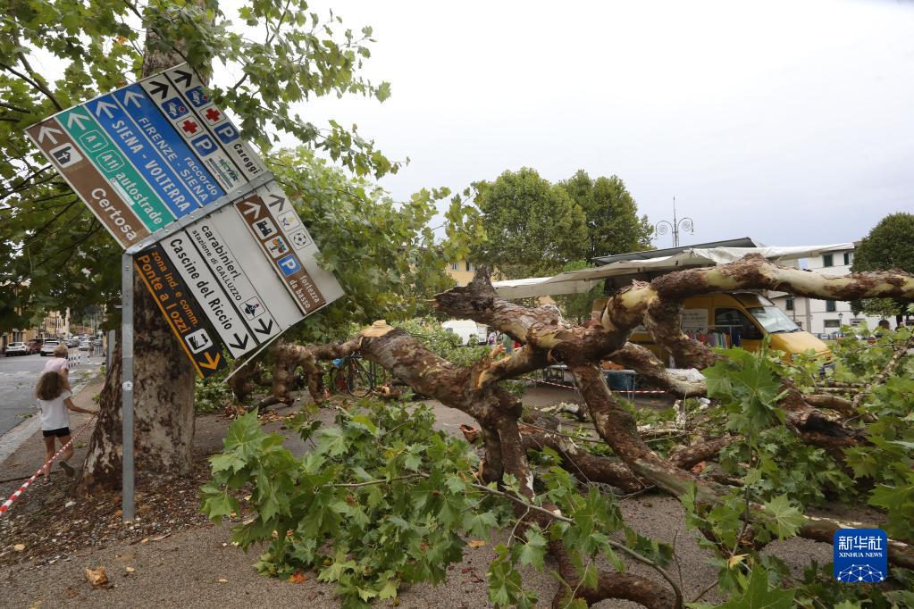 這是8月18日在意大利托斯卡納大區(qū)首府佛羅倫薩拍攝的被刮倒的樹木和路牌。