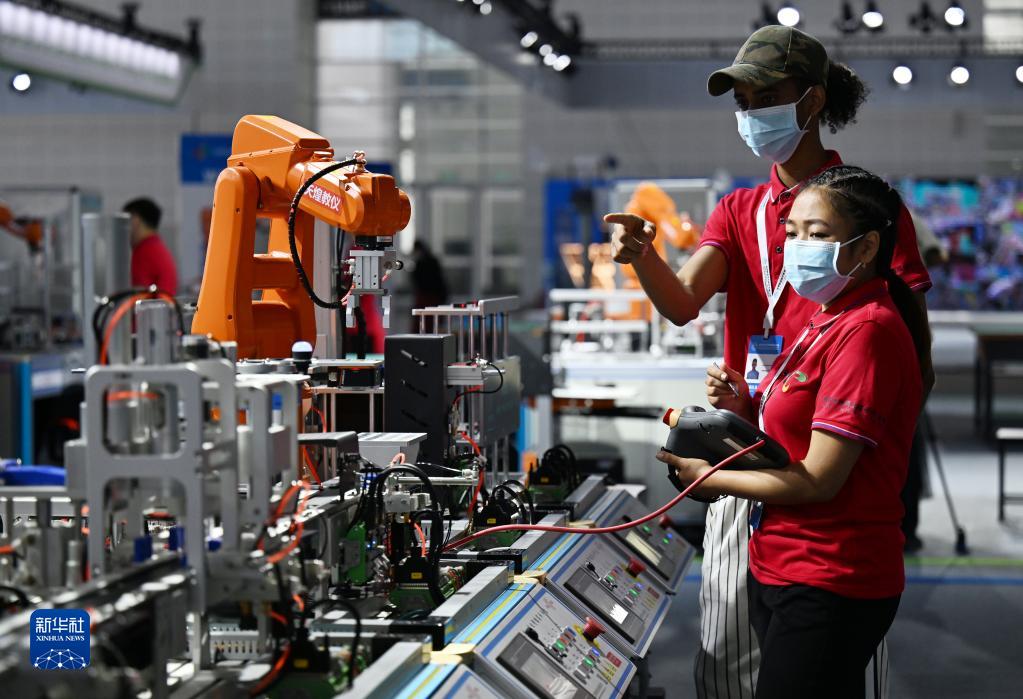 8月19日,首屆世界職業院校技能大賽的參賽選手在國家會展中心(天津)操作機械設備。