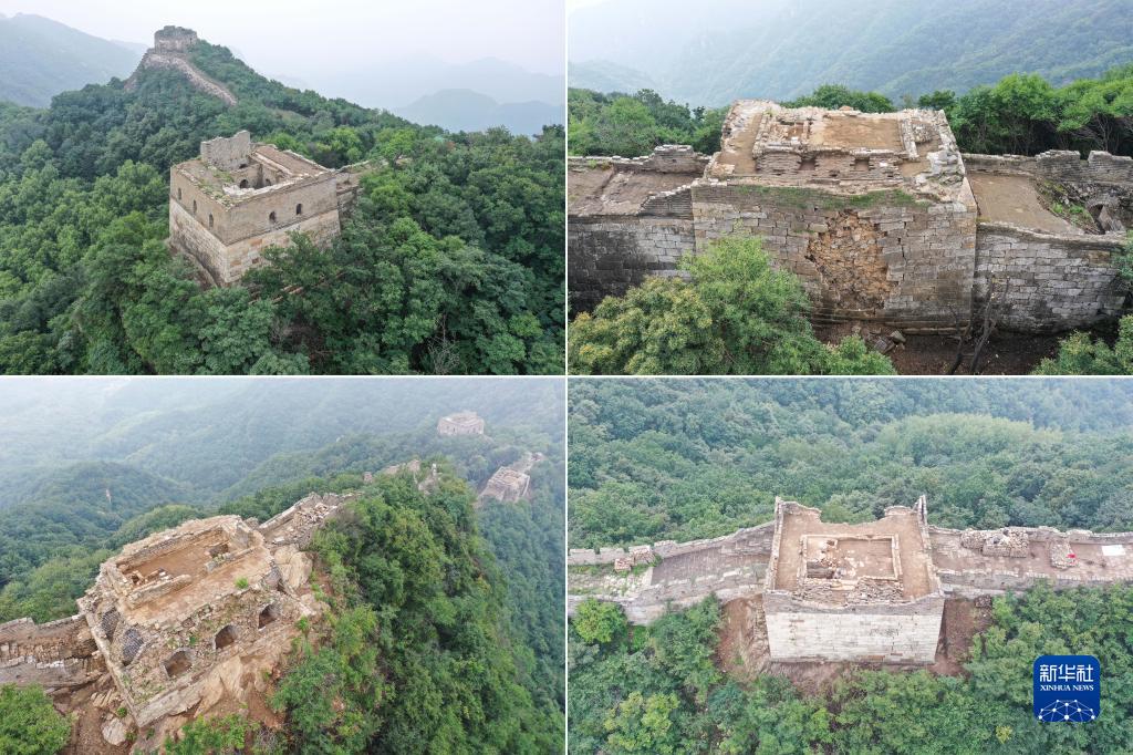 這是研究性修繕段的幾個敵臺的拼版照片:左上為正在進行考古發掘的142號敵臺;右上為已完成考古發掘的143號敵臺;左下為已完成考古發掘的144號敵臺;右下為已完成考古發掘的145號敵臺(8月17日攝,無人機照片)。