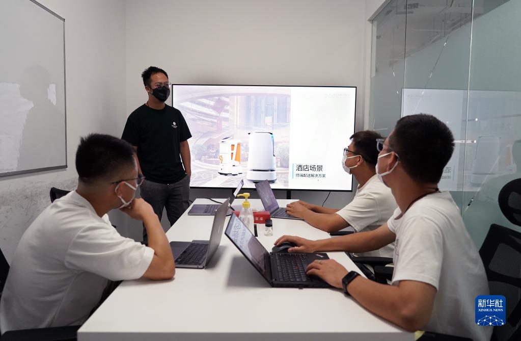 在北京市海淀區中關村東升科技園,一家商用機器人公司的工作團隊在進行討論(8月17日攝)。