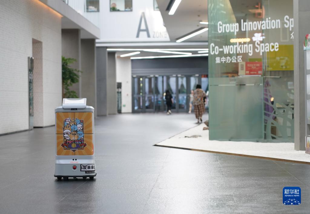 在北京市海淀區(qū)中關(guān)村東升科技園,服務(wù)機器人在辦公樓內(nèi)巡游(8月15日攝)。