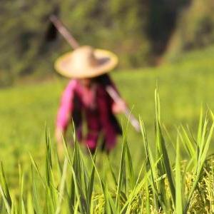 8月20日,貴州省丹寨縣高要村的村民在稻田里查看水稻長勢。