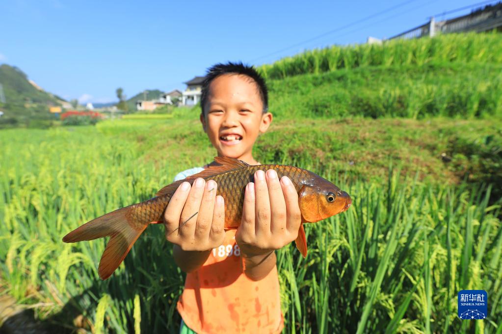 8月20日,貴州省丹寨縣高要村的一名小朋友展示從稻田里捉到的魚。