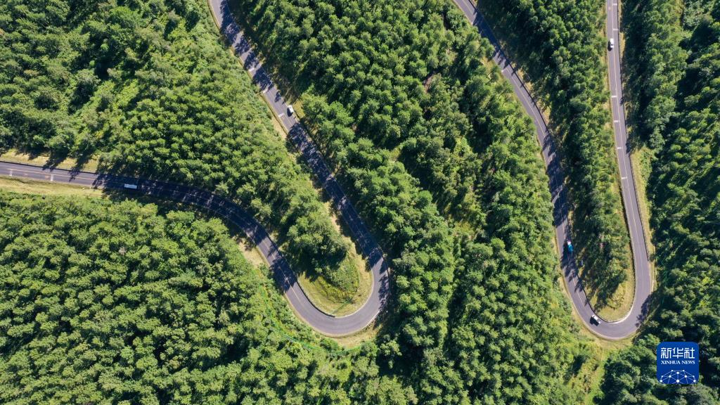 8月20日,車輛在塞罕壩國家森林公園的道路上行駛(無人機照片)。