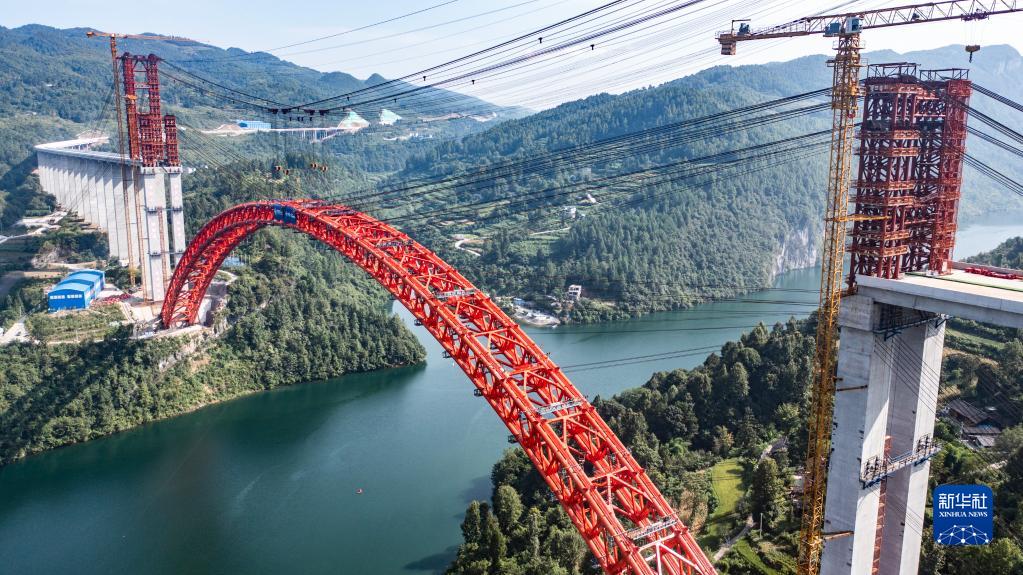 8月15日拍攝的德余高速烏江特大橋合龍現(xiàn)場(chǎng)(無(wú)人機(jī)照片)。