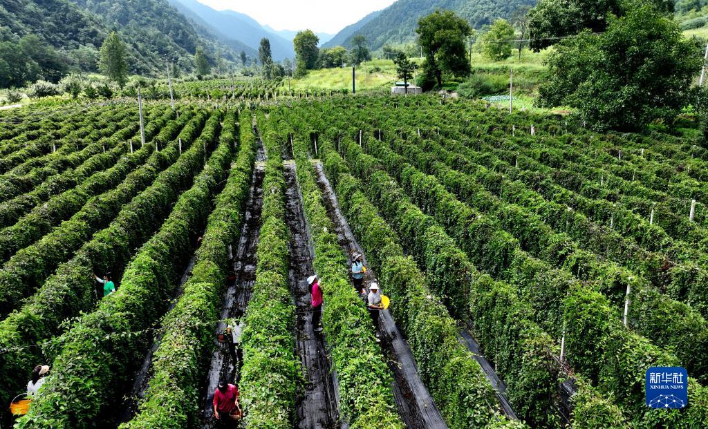 8月21日,洛南縣煜正中藥材專業合作社的員工在田間采摘五味子(無人機照片)。