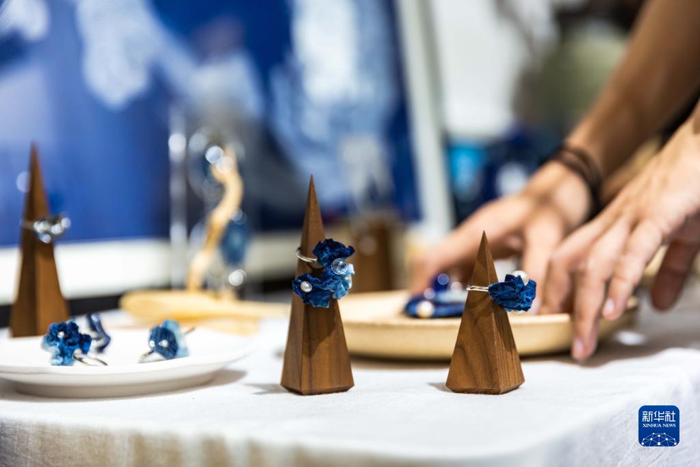 8月18日,張娟娟在蠟染工作室整理制作好的蠟染手工藝品。