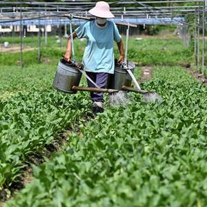 8月22日,三亞市三川葉菜產(chǎn)銷農(nóng)民專業(yè)合作社的農(nóng)民在田間澆水。