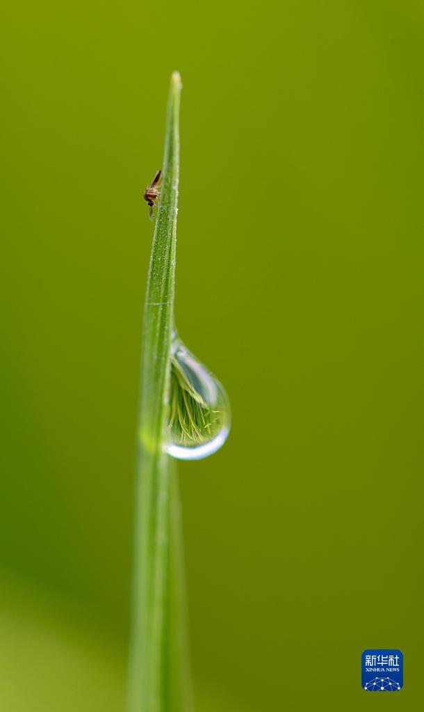 8月17日,在貴州省黔東南苗族侗族自治州丹寨縣龍泉鎮展良村,稻葉上的露珠映出了即將成熟的稻谷。