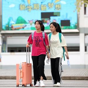 8月22日,在貴州省黔東南苗族侗族自治州丹寨縣第二中學,初一年級新生(左)在弟弟的陪伴下前往報到處。