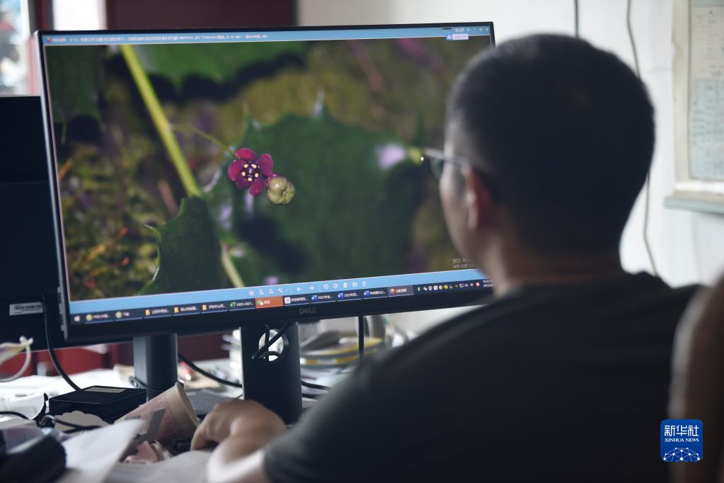 胡君在辦公室查看尖齒衛(wèi)矛花和果實(shí)的照片(8月17日攝)。新華社記者 劉坤 攝