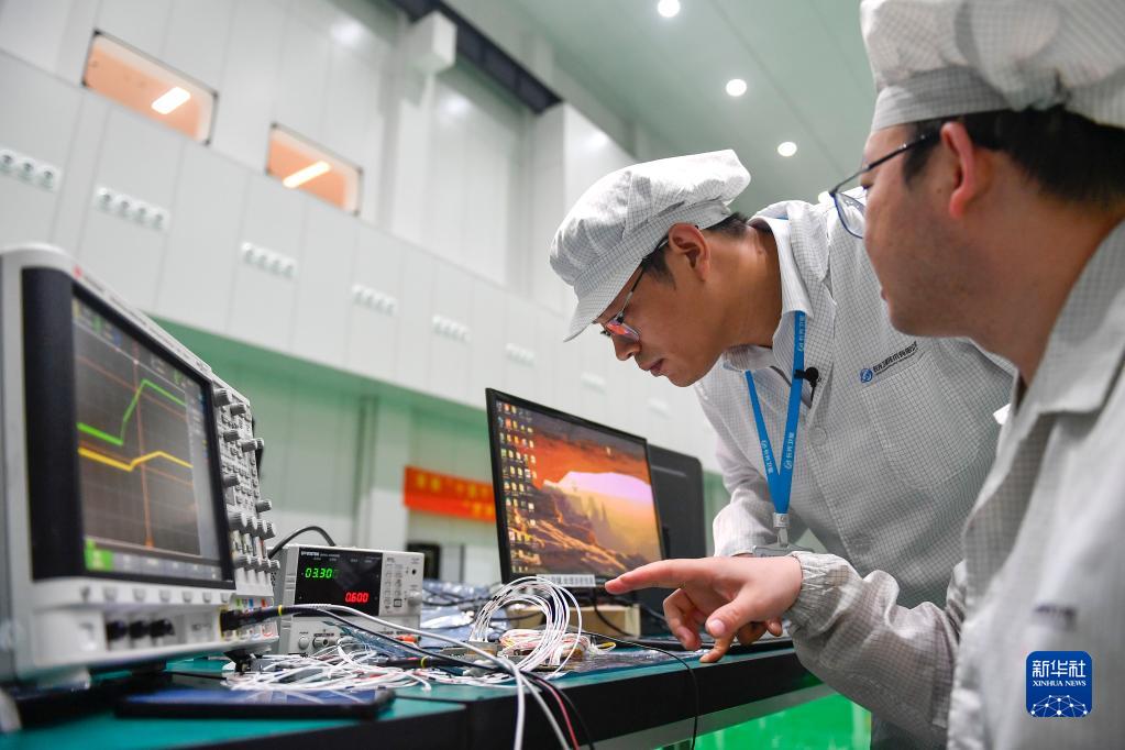 在長光衛星技術股份有限公司總裝車間,項目總師陳茂勝(左)觀察衛星組件的調試參數(2022年8月3日攝)。