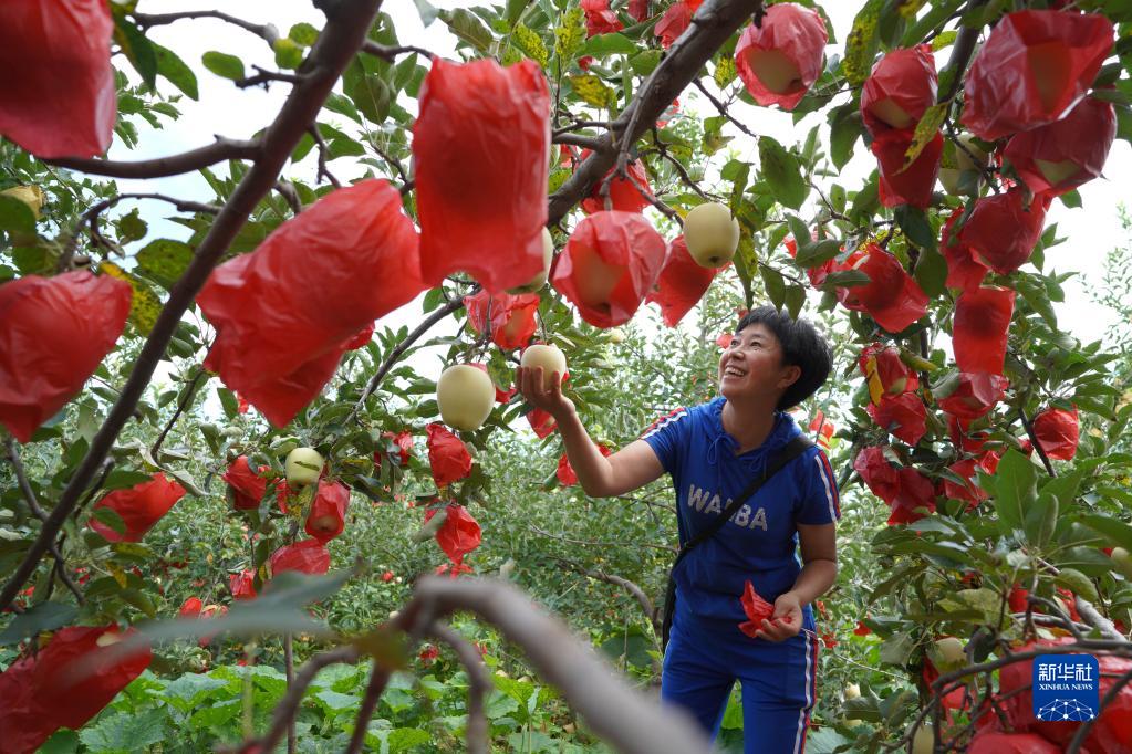 8月22日,河北省邢臺市內(nèi)丘縣崗底村果農(nóng)在果園里管護(hù)早熟蘋果。