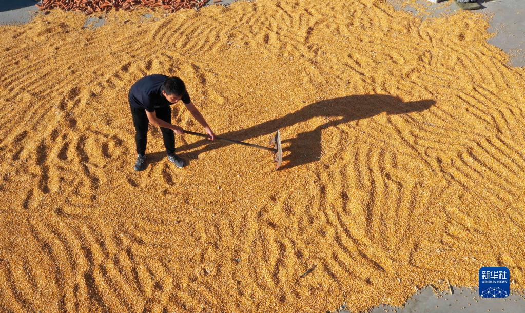 8月22日,河北省玉田縣虹橋鎮南會村村民在場院晾曬玉米(無人機照片)。