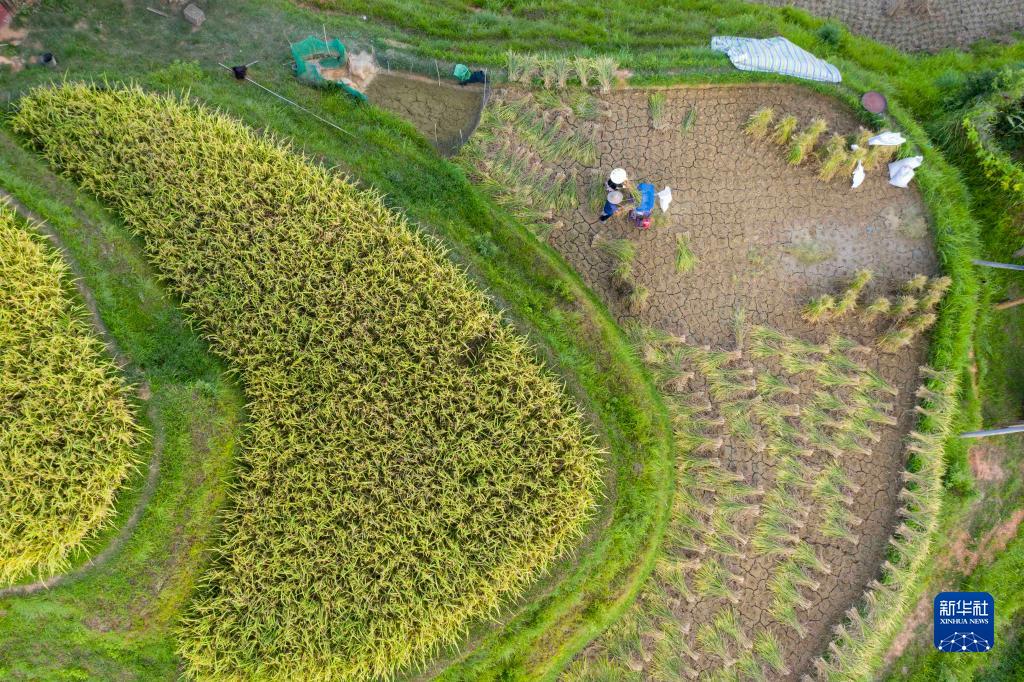 8月22日,貴州省黔東南苗族侗族自治州從江縣丙妹鎮(zhèn)岜沙村村民在收割稻谷(無人機照片)。