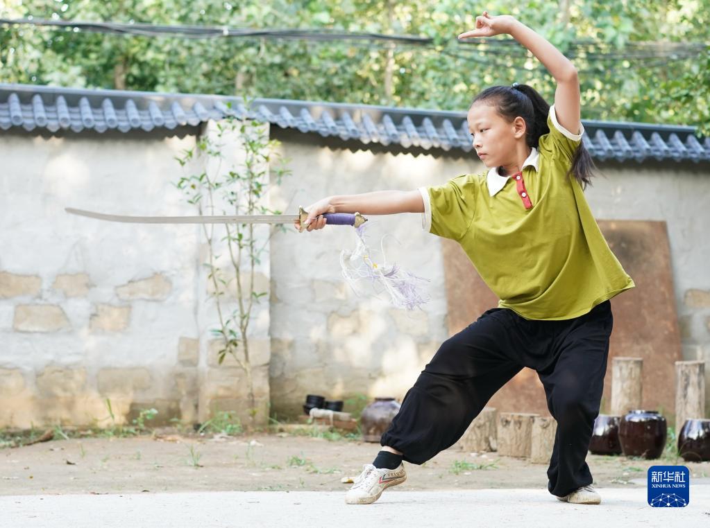 劉龍二女兒劉亦點(diǎn)在展示初級(jí)劍(8月16日攝)。