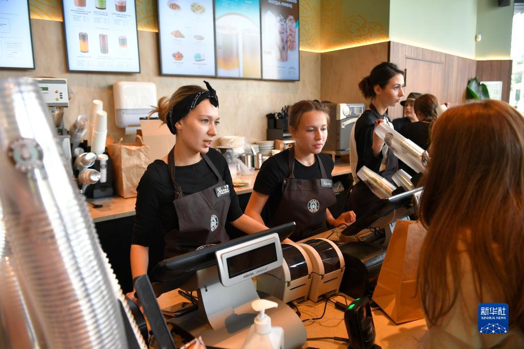 8月22日,工作人員在俄羅斯莫斯科的一家“星咖啡”門店為顧客點餐。