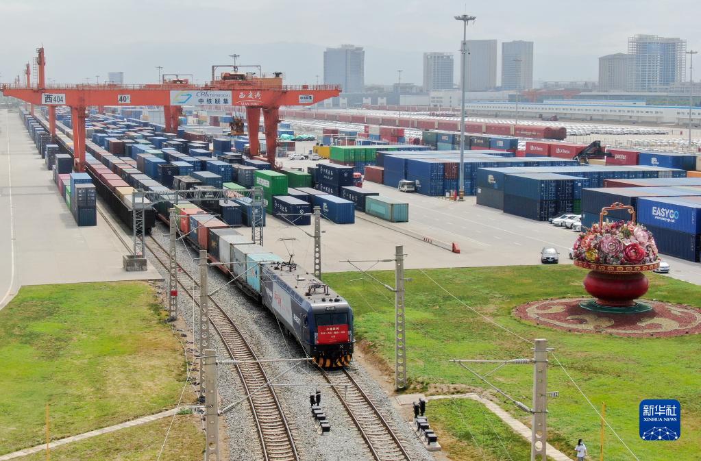 8月23日,陜西首趟中越國際貨運班列準備從西安國際港站出發開往越南河內(無人機照片)。