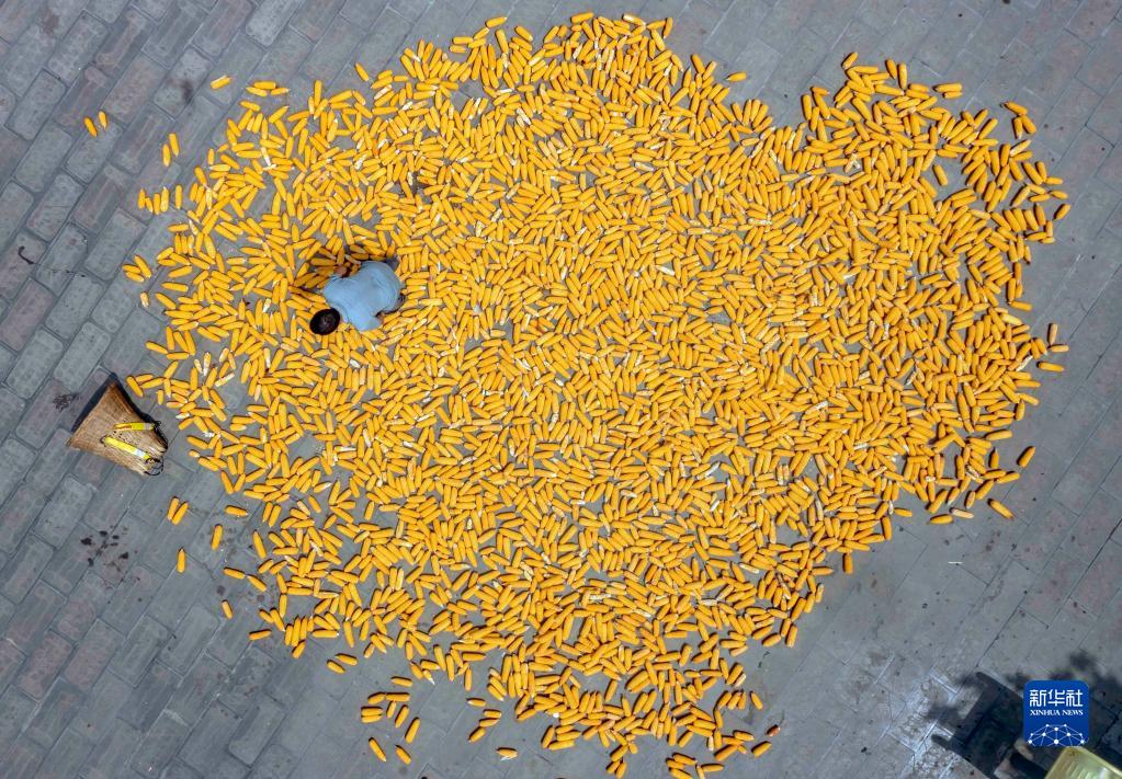 8月23日,村民在貴州省黔西市谷里鎮谷興社區晾曬玉米(無人機照片)。