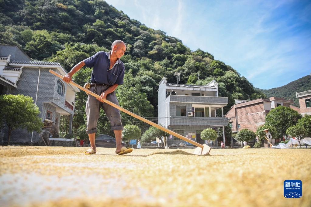 8月23日,湖南省永州市藍山縣祠堂圩鎮(zhèn)虎溪村村民在晾曬稻谷。