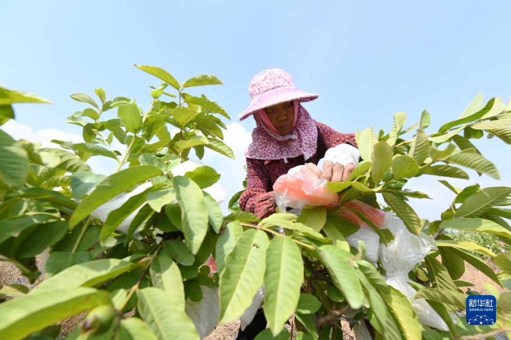 8月23日,在福建省福清市海口鎮(zhèn)岑兜村的一處農(nóng)場(chǎng),果農(nóng)忙著疏果、套袋。