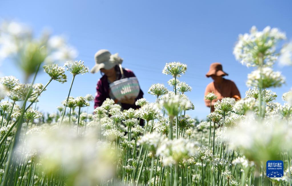 8月23日,山東省淄博市沂源縣悅莊鎮朱家莊村的農民在采摘韭菜花。